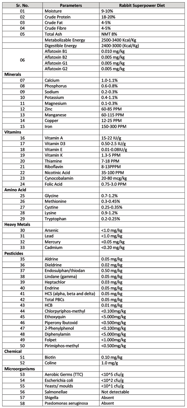Dried Alfalfa Hay, Wheat, Starch, Maize, Maize starch, Maize gluten, Vegetable refined oil, Soya bean Meals, Isolated Soya Protein and Soluble Phosphorous in their highest available biological form, Premix (Essential Minerals and Vitamins in required amount)